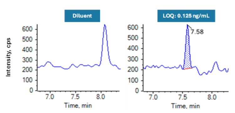 An LOQ of 0.125 ng/mL was achieved for the quantitation of NNSL with no interference in the diluent blank (Figure 4).