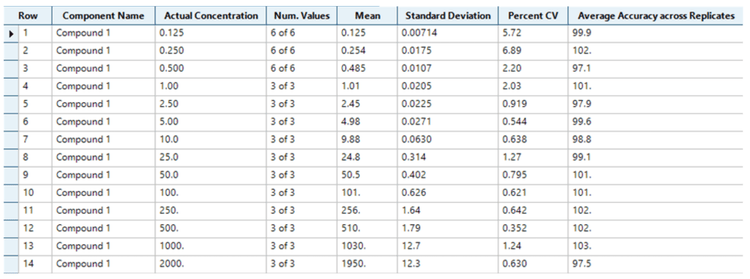Analytical performance was evaluated based on the criteria that the accuracy of the calculated mean should be between 80% and 120% at the LOQ and between 85% and 115% at the higher concentrations. In addition, the %CV of the calculated mean of concentration should be <20% at the LOQ and <15% at all higher concentrations.