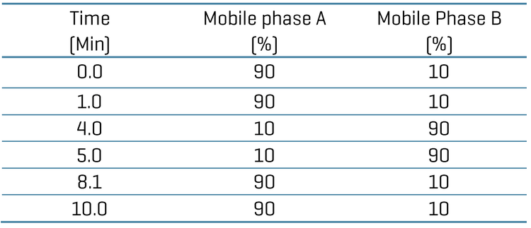 Chromatography: Analytical separation was performed on the ExionLC system (SCIEX) using a Phenomenex Kinetex XB C18 column (2.1 × 100 mm, 2.6 µm) at a flow rate of 0.4 mL/min. Mobile phase A was 0.1% (v/v) formic acid in water and mobile phase B was 0.1% (v/v) formic acid in acet onitrile. The column temperature was set to 40 °C. The gradient conditions used are summarized in Table 1. A 5 µL sample aliquot was injected for LC-MS/MS analysis. The LC flow was diverted to waste for the first 3 min to prevent SH API from entering the ma ss spectrometer.