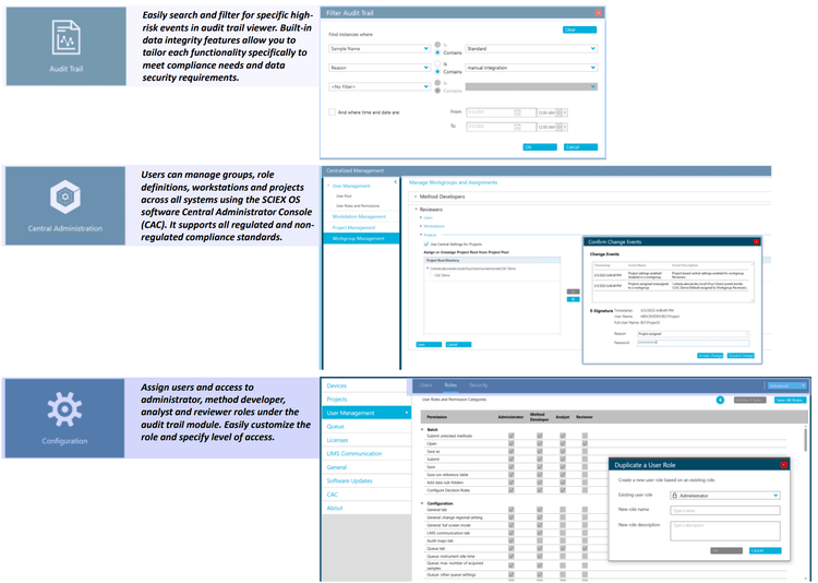 Figure 6 illustrates the features of SCIEX OS software used to monitor the audit trail, acquire and process data, and configure user access. The audit trail feature enables users to audit critical user actions and locks in data integrity.
