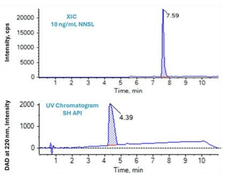 Sample preparation: 1 mg of SH was weighed into a suitable vessel, and then 1 mL of 0.1% formic acid in 90:10 (v/v) methanol:water was added and vortexed thoroughly to obtain a 1 mg/mL concentration. The spiked API samples were prepared by spiking 1 mg/mL SH API samples with NNSL , resulting in a 0.25 ng/mg.