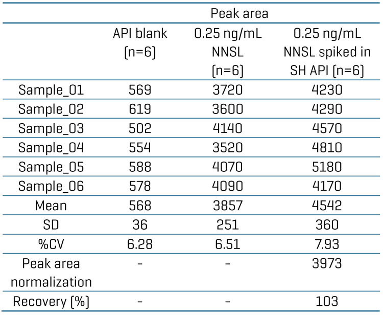 The average recovery for the sample spiked with 0. 25 ng/mL NNSL was 103%. Since NNSL was detected in the SH API (Figure 1), recovery was calculated by subtracting the peak area from NNSL in the control API from the spiked sample (Table 4). %CV was below 8% for the API blank, NNSL in neat, and NNSL spiked in SH API, based on replicate analysis.