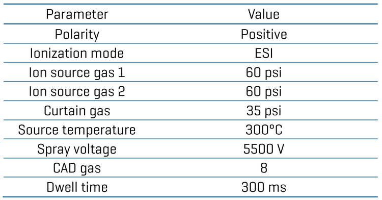 Mass spectrometry: The optimized source and gas parameters are listed in Table 2, and the MRM parameters are included in Table 3.