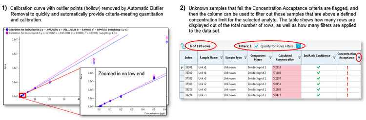 Automatic Outlier Removal allows the user to set criteria for the automatic removal of standard outliers from the calibration curve. The user controls what regression linearity, accuracy of standards, precision of replicates, and outlier tolerance are acceptable, and the algorithm then builds the calibration curve for each standard to meet the defined criteria. The algorithm helps to alleviate the pain of manually establishing many acceptable calibration curves when working with many analytes varying in sensitivity and performance. Both features help to maintain consistent results among different analysts working on the same method.