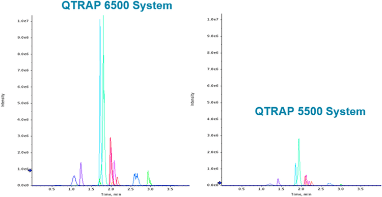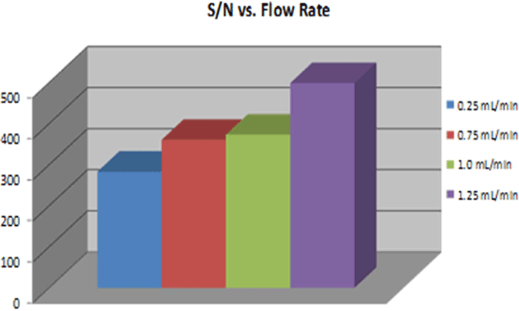 Higher desolvation capacity in the spray region also enables the use of LC methods with higher flow rates, which reduces run times and increases sample throughput. This enables researchers to take full advantage of the new fused core columns, which operate most efficiently at high flow rates. Both the LC peak area and S/N ratio measured with the IonDrive Turbo V source on the QTRAP 6500 system maintain full performance, and can even improve, at higher LC flow rates (Figure 5).