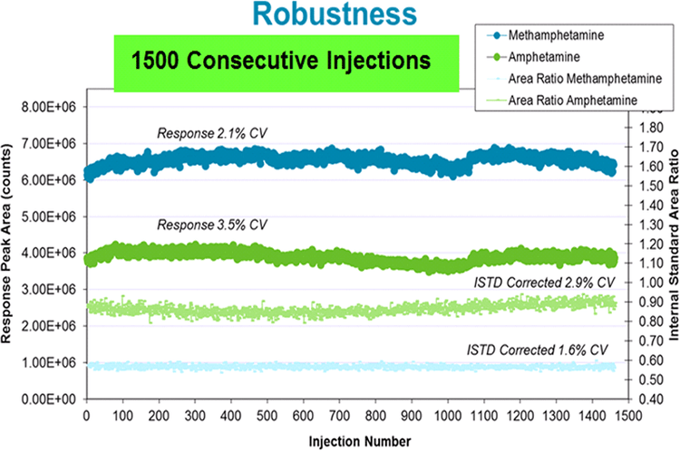 Multi-day robustness was evaluated by using 1,500 consecutive injections of methamphetamine and amphetamine in plasma in a continuously running batch lasting 3 days. The optimized curtain gas geometry and the IonDrive QJet ion guide result in rugged performance for analysis of samples in biological matrices. No divert valve was used. The relative standard deviation for all 1500 injections was < 3.5% for raw peak areas and < 2.9% for analyte to internal standard ratios, as show in Figure 4.
