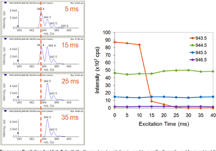 The in-trap fragmentation is achieved through the application of a single wavelength / narrow band excitation. As shown in Figure 3, this allows very selective fragmentation. The C12 isotope of a product ion can be specifically excited and fragmented to completion with minimal fragmentation of the C13 isotope. This provides further selectivity advantages in the removal of interfering background.