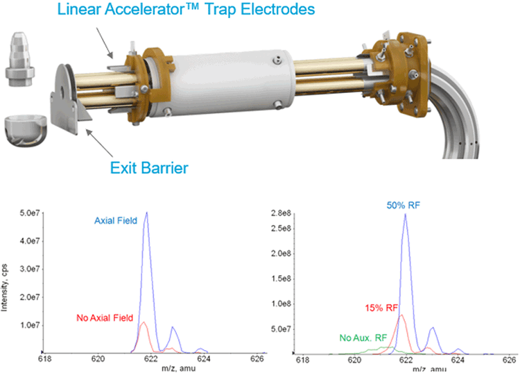 Linear Accelerator trap technology has resulted in ground breaking improvement in the handling of ions inside the linear ion trap of the QTRAP systems, resulting in up to 100x more sensitivity. Trapped ions are manipulated within the linear ion trap through the use of auxiliary DC fields provided by the addition of small electrodes (Figure 4, top). Ions are gently moved toward the extraction region of the linear ion trap during the cooling period by a voltage applied to the trap collar. A potential barrier is created by increasing the potential on the auxiliary electrodes just before the mass scan to complete the ion concentration process. The application of this axial field has a significant effect on sensitivity (Figure 4, bottom left).
