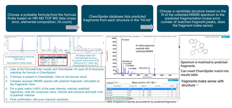 How: Processing X500R QTOF System data using SCIEX OS Software utilizes using the experimentally determined high-resolution and accurate mass of the detected peak and the FormulaFinder feature to generate candidate empirical formulae for that peak. Candidate formula coupled with MS/MS spectra and the simple interface with the extensive ChemSpider database are used to evaluate candidate structures by matching in silico fragmentation pattern prediction of candidate structures.