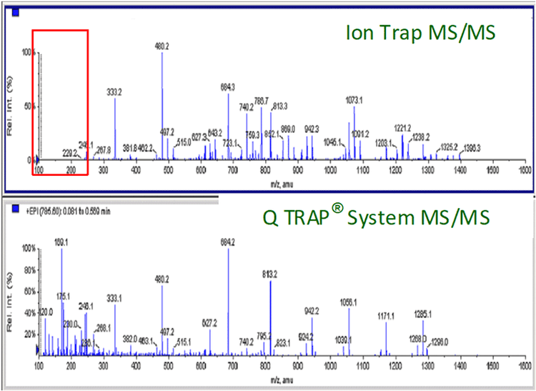 The Enhanced Product Ion Scan is the standard method for performing MS/MS on the QTRAP System. It is actually a hybrid QqQ/LIT scan because it combines the capabilities of the QqQ with the LIT to achieve a performance level not possible with either analyzer alone. The fragmentation is done in the collision cell and thus provides the information rich MS/MS spectrum typical of collisionally activated dissociation (CAD) fragmentation seen on QqTOF and triple quadrupole instruments4. In this scan mode, the precursor ion to be fragmented is first selected in Q1 with a mass window of 1-4 amu wide, filtering out all other ions. The precursor ion is fragmented by CAD in the Q2 collision cell. The fragment ions generated are captured in the ion trap; then scanned out at one of three scan speeds, depending on the required fragment ion resolution (Figure 6). This provides extremely high sensitivity, high quality MS/MS data because the fragment ions are captured and analyzed in the LIT. However, it is important to note that because the mass isolation step is performed in Q1 and  not  within the ion trap, a complete spectrum is obtained covering the full mass range. This is in contrast to when isolation and fragmentation are performed within the ion trap itself where masses from the lower 1/3 of the parent ion will be “cut off” and unobservable due to the energetics required for the experiment. Thus an EPI scan does not suffer from the low mass cut-off problem typical of other ion trap mass analyzers (Figure 7).