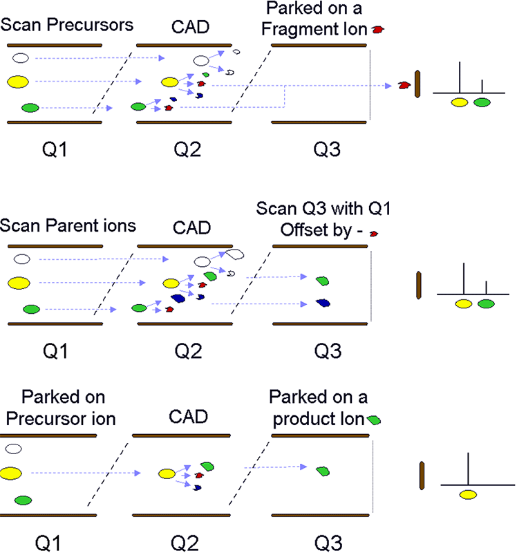 Figure 4. Triple Quadrupole Scan Types. Top – Precursor Ion scan. Middle – Neutral Loss scan. Bottom – MRM scan.