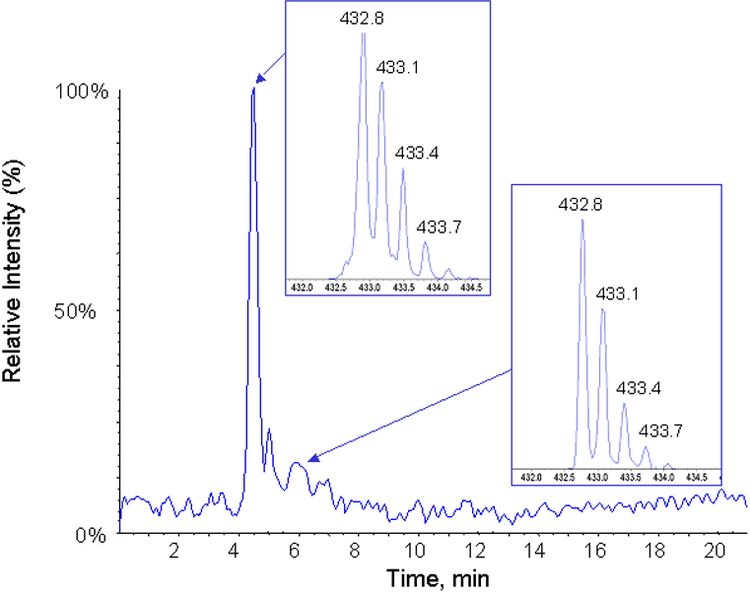 Figure 9. Dynamic fill time (DFT). Dynamic Fill Time carefully controls the number of ions that fill the linear ion trap so that optimum sensitivity and good resolution can be achieved across the LC-MS peak. Shown here is good resolution achieved at the LC peak apex where DFT automatically reduces the trap filling to reduce the chance of saturation (top) and good sensitivity obtained low in the peak tail where the trap is filled for longer (right).
