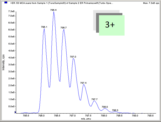 Figure 5. Enhanced resolution scan (ER). A high resolution scan can be obtained on any ion of interest. This can be used to determine the charge state of an ion and is typically used on the fly during data dependent acquisition experiments.