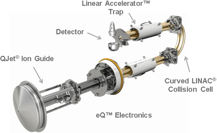Figure 1. QTRAP System ion rail. The unique configuration of the QTRAP  S ystem consists of a triple quadruple-based ion rail, where the third quadrupole (Q3) can also operate as a linear ion trap (LIT). This configuration provides a broad range of traditional scan functions along with new and unique workflows that combine qualitative and quantitative data within one analysis without sacrificing performance.
