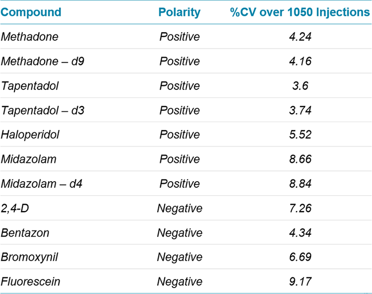 Small molecule applications often require use of both instrument polarities due to the diversity in molecular structure. To ensure negative mode performance, the most challenging type of experiment was used for testing: polarity switching experiments were conducted with MRM analysis on the QTRAP 6500+ system (Table 2). Using a mixture of 11 analytes, peak areas across 1050 injections were monitored with very good reproducibility.
