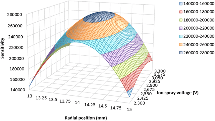 Design of Experiments (DOE) work was performed to explore the range of tuning options to find the optimal settings across various flow regimes including the nanoflow regime and low and high microflow regimes. Key parameters explored during the DOE investigations were sprayer positioning, sprayer tip protrusion, nebulizer gas flows and electrospray potential. An example of this type of investigation for the nanoflow sprayer is shown in Figure 2. In this example, a wide range of sprayer positions relative to the center of the orifice aperture were tested at a range of different ionization potentials, measuring analyte sensitivity. From the shape of the surface, the optimal setting can be determined as well as the size of the sweet spot for optimization.