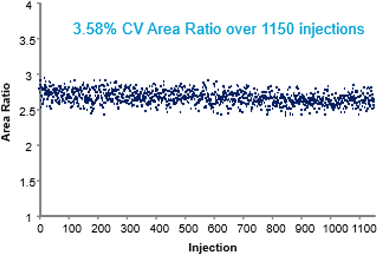 To demonstrate utility of the OptiFlow source for higher throughput applications, a series of robustness experiments were performed. Using a simple peptide mixture, long term spray robustness was investigated using a targeted MRM experiment on the QTRAP 6500+ system (Figure 4). Over 1150 injections, very good spray stability and therefore low peak area ratio variance was observed (3.6% CV).
