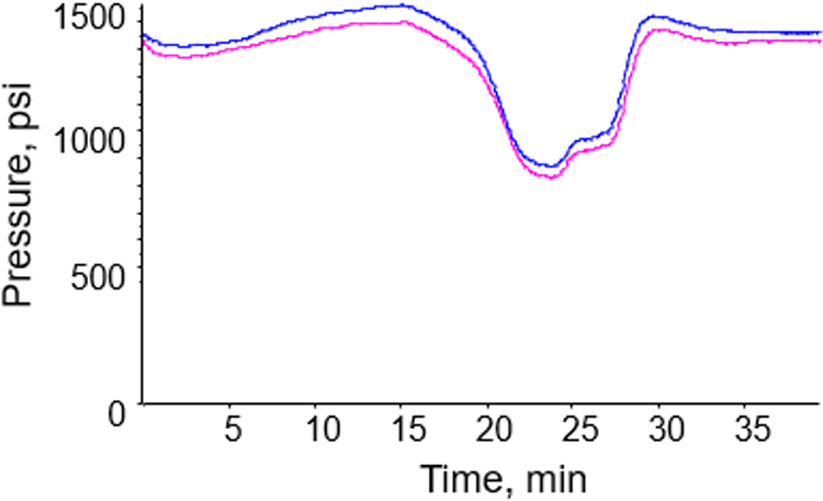 Very low flow chromatography can be challenging because of the narrow bore tubing and columns that are required, making clogging of columns and spray tips a constant worry. Extensive work was done to develop the electrospray electrodes for the OptiFlow Source (Figure 6). In the final design, the electrodes have 20 µm inner diameter and the tip is ground on the outside of the electrode to provide a taper. A benefit of this innovative design is that there is no internal constriction, reducing the chances of electrode clogging. Nanoflow LC-MS runs on many different sample types were performed over the course of 30 days and the system pressure showed minimal change across the runs showing that no clogging of the electrode occurred (Figure 7).