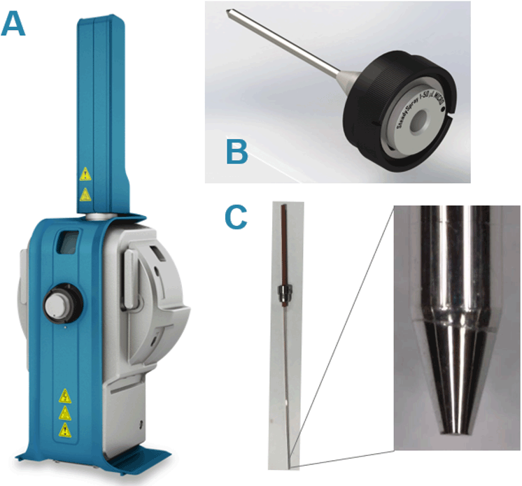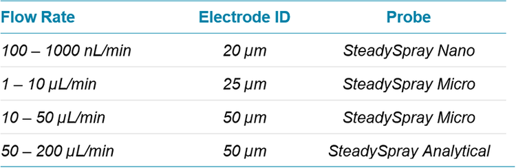 However, because of the reduced flow rates relative to high flow rate ESI, it is important to minimize dead volume across the full LC flow path including the source and ionization sprayer. The OptiFlow source has been optimized for flow rates down to 1 µL/min with the short probe and electrode (half the length of current electrodes, Figure 3). Also, mounting the column directly onto the electrode ensures minimal post column dead volume. The metallized tapered tip has also been designed and optimized for flow stability and performance at low flow rates (Figure 3C).