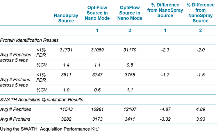 A similar experiment was performed for SWATH acquisition, comparing the 3 sources on a single instrument (Table 4, bottom), Again, very similar results were obtained across the 3 sources, with deviations less than ±5%. These results demonstrate that the plug and play nanoflow probes and electrodes provide optimized performance.