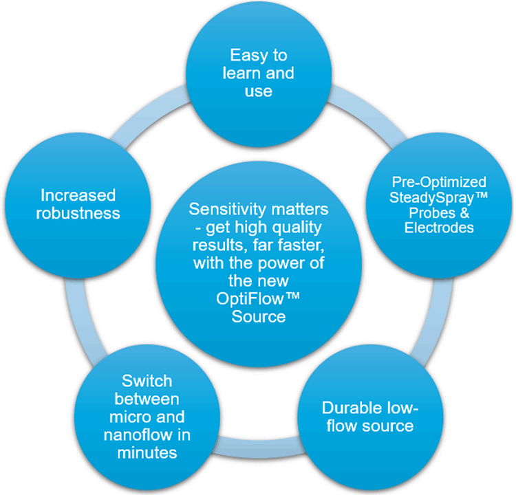 This led SCIEX to develop the OptiFlow source, a single source that would cover the full spectrum of low flow rates for high sensitivity LC-MS analysis. Significant research was done to develop a low flow source that was sensitive, while maintaining high robustness and ease of use of higher flow sources.3 The ability to easily switch between flow regimes was also critical in the source design. Removing the barrier of switching helps researchers choose the right flow rate for every project.