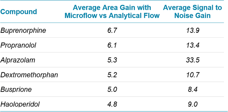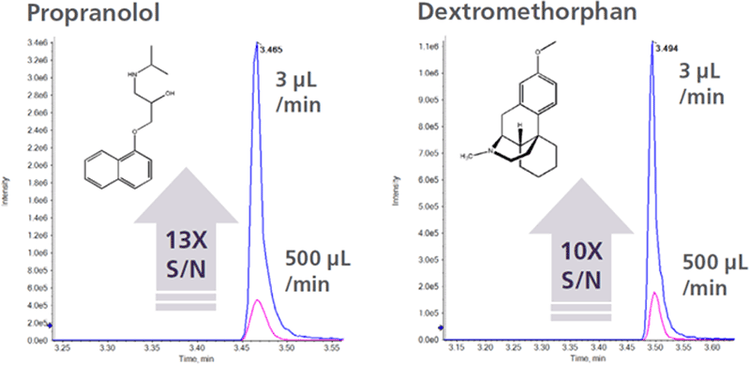 Sensitivity comparisons were also performed between analytical and microflow ESI to demonstrate the gains in observed peak areas and S/N (Table 3 and Figure 5) resulting from decreasing the solvent flow rate.