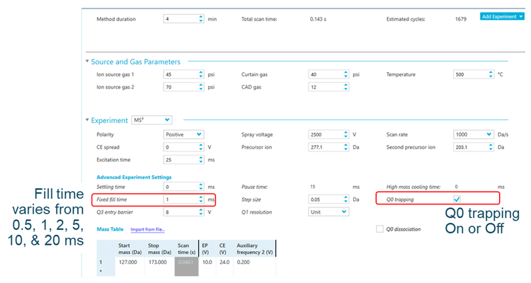 The performance of the LIT-MRM3 workflow was further compared across different fixed fill times when the Q0 trapping was turned on or off. The results of this analysis are shown in Table 2.