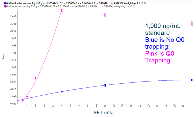 As might be expected, increasing the FFT resulted in lower observed LLOQ values for both MRM3 transitions. The addition of Q0 trapping also facilitated the ability to detect lower levels of analyte at lower FFTs. However, the signal tended to become saturated with Q0 trapping on as FFT was increased (Figure 4). This assessment can help inform future method development of MRM3 methods using the linear ion trap on QTRAP systems.