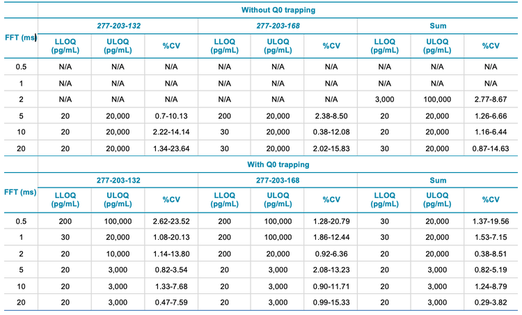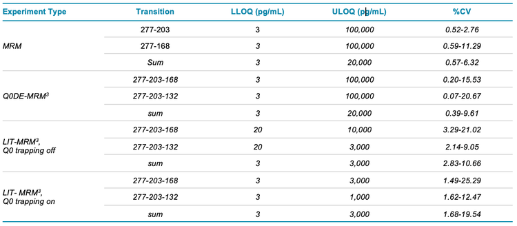 Next, the data generated by the Q0DE-MRM3 and LIT-MRM3 approaches were compared. This comparison required additional experiments to consider the impact of Q0 trapping. As seen in the metrics summarized in Table 1, the LIT-MRM3 results vary in LLOQ and LDR and are of lower quality compared to the MRM and Q0DE-MRM3 data quality.