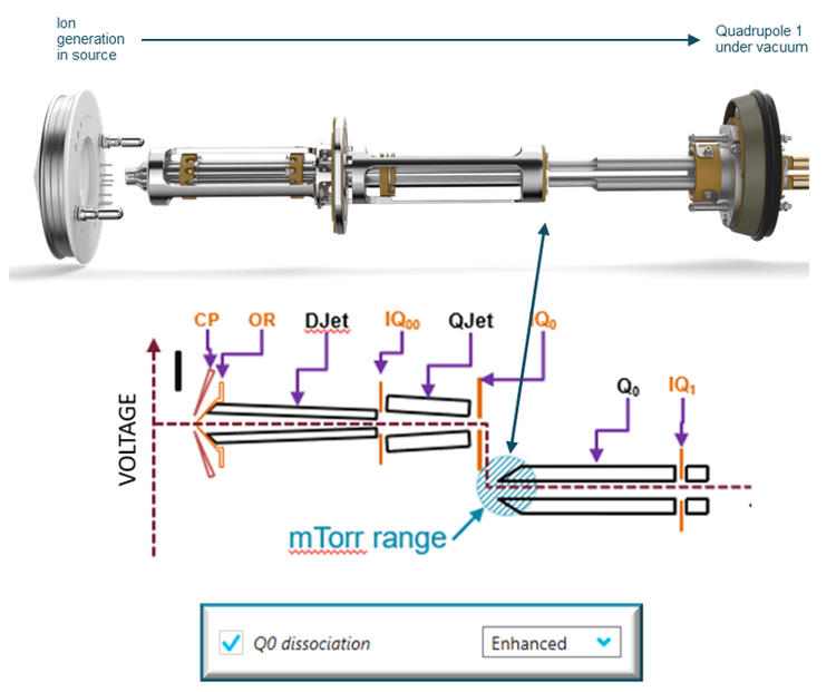 The SCIEX 7500 system, operating as a QTRAP system, has a new feature that utilizes Q0 dissociation settings to provide an alternative way to remove interference or increase the signal-to-noise ratio. Within the Q0 dissociation setting, either “Simple” or “Enhanced” can be selected. Q0 dissociation-simple has very strong de-clustering potential, which can help break up clusters. The Q0-enhanced option produces conditions that are similar to the use of collision energy in the Q2 collision cell and is intended for the collision-induced dissociation (CID) of precursor ions upstream before Q0, instead of Q2, as shown in Figure 1.